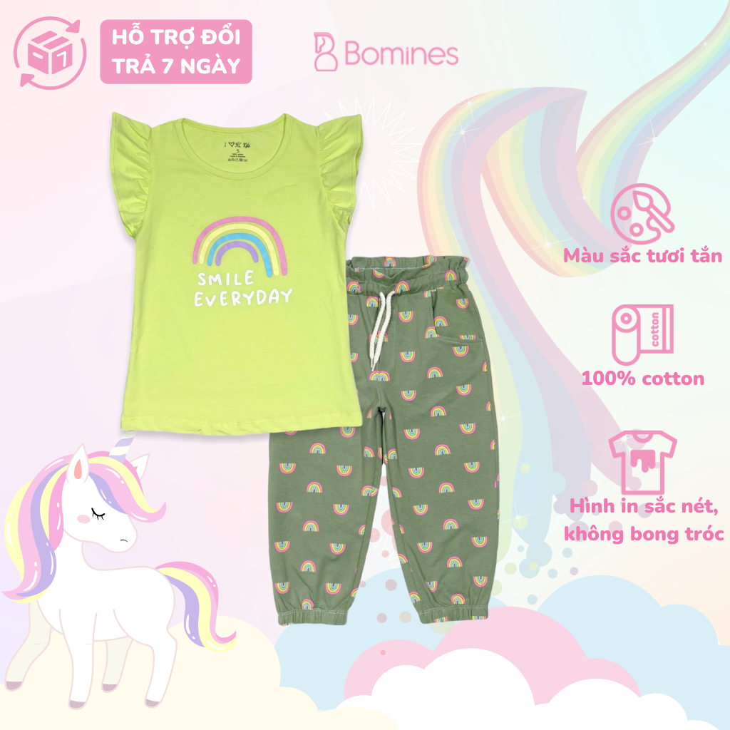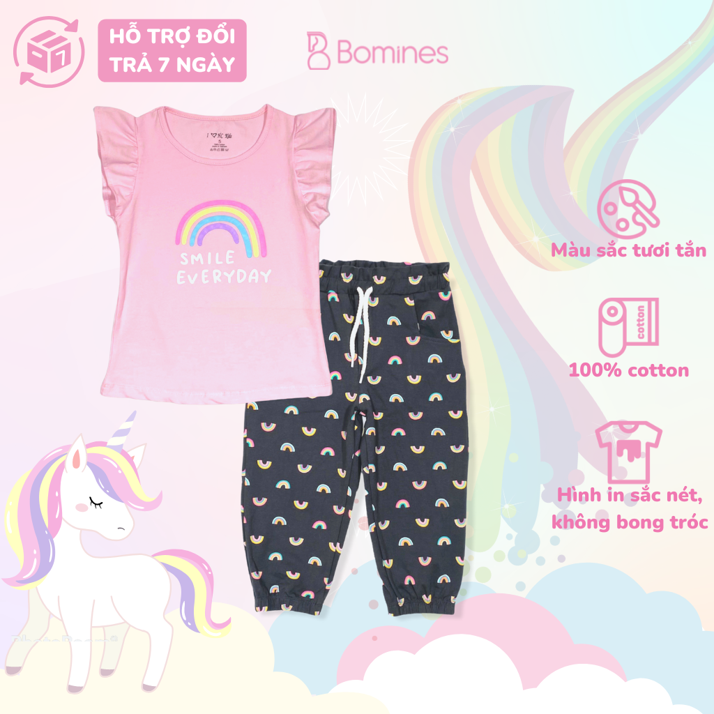 Set bộ cho bé gái, áo tay cánh tiên xinh xắn phối kèm quần jogger ngố trên gối, họa tiết cầu vồng màu sắc ngọt ngào. Bé đi học hoặc đi chơi đều xinh.