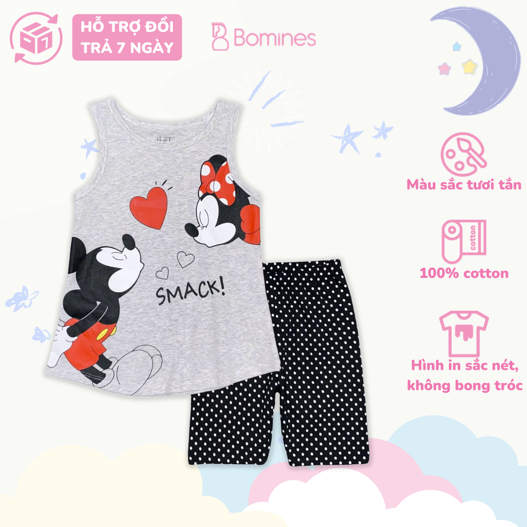 Đồ bộ ba lỗ phối kèm quần legging lửng. Hình in sắc nét bền đẹp, họa tiết chuột Mickey, Minnie xinh xắn.
