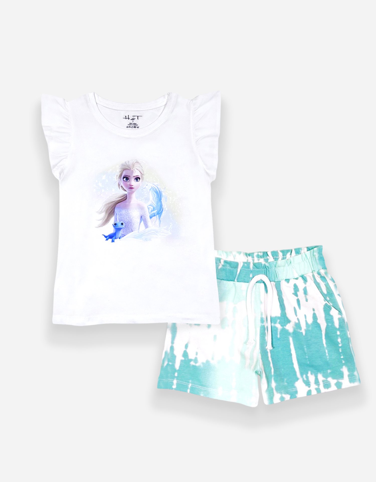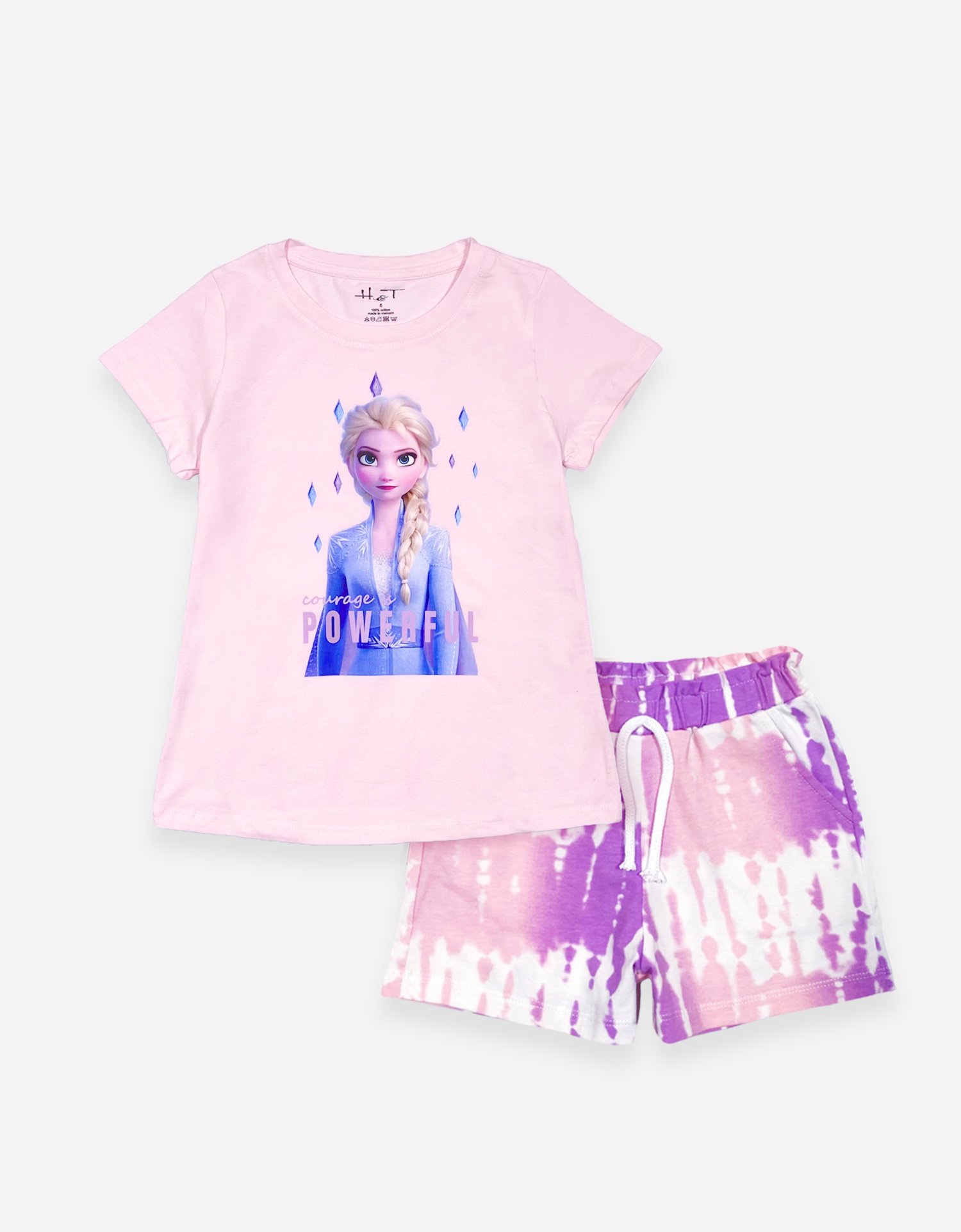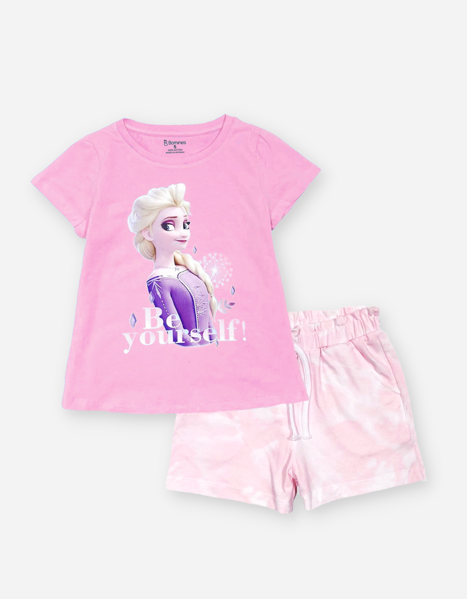 Đồ bộ bé gái tay ngắn quần short mặc nhà họa tiết Elsa xinh xắn, chất vải thun cotton 100% co giãn 4 chiều phối kèm quần short họa tiết loang màu lạ mắt, chất liệu cotton thấm hút mồ hôi tốt giúp bé thoải mái vui chơi suốt ngày dài mà không lo oi bức khó chịu.