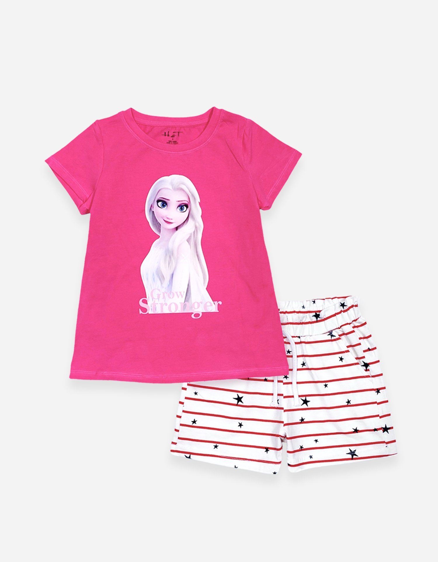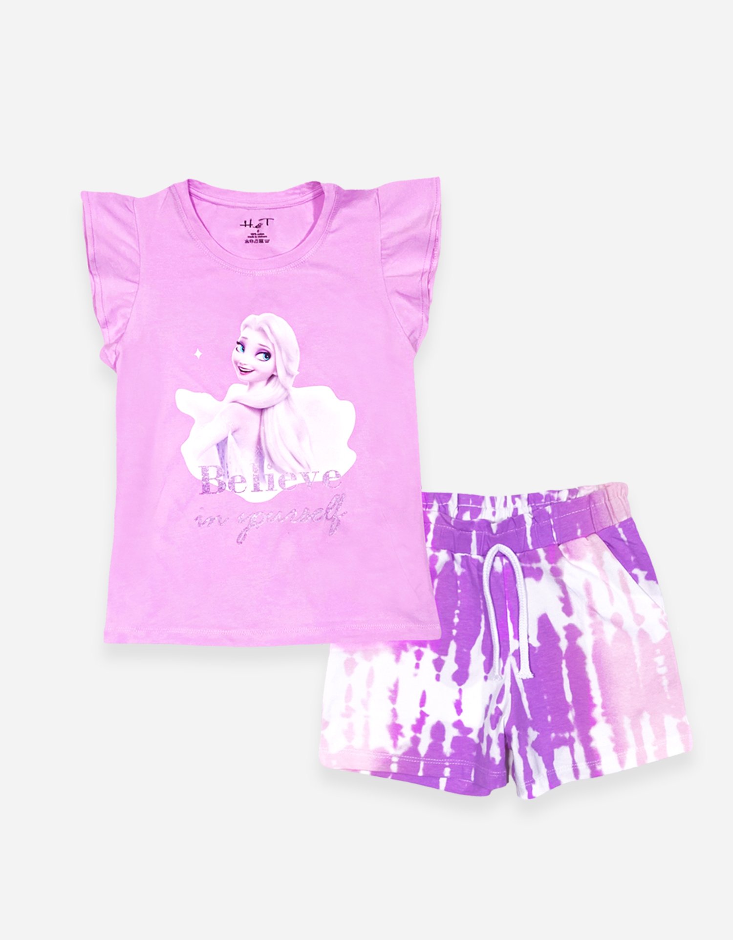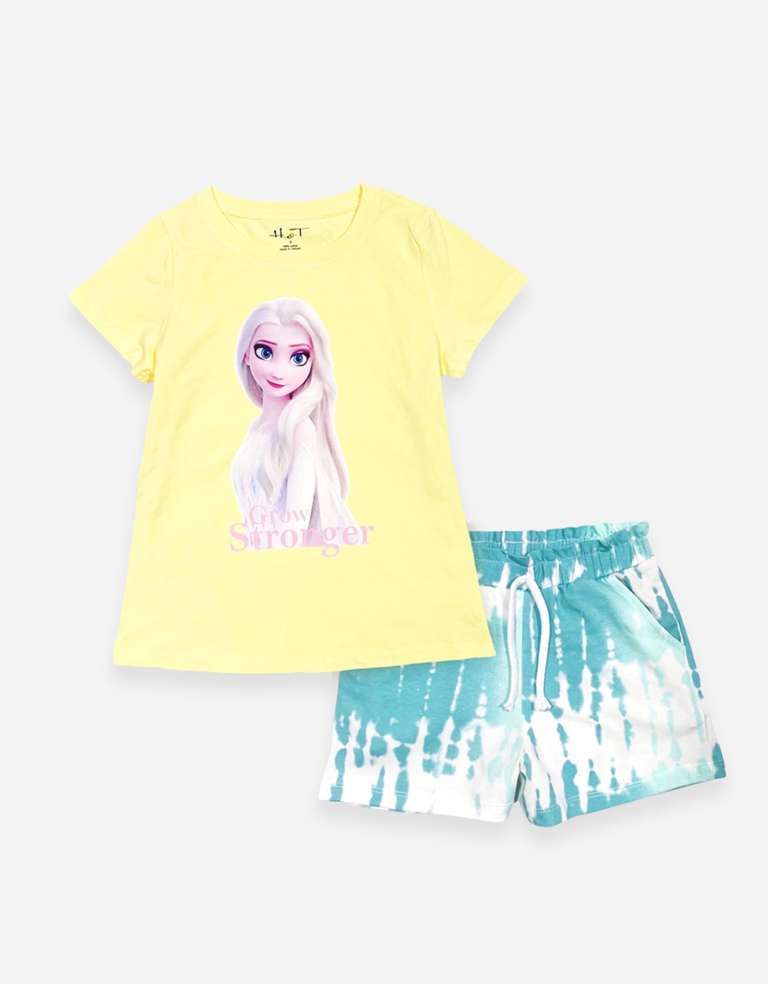 Đồ bộ bé gái tay ngắn quần short mặc nhà họa tiết Elsa xinh xắn, chất vải thun cotton 100% co giãn 4 chiều phối kèm quần short họa tiết loang màu lạ mắt, chất liệu cotton thấm hút mồ hôi tốt giúp bé thoải mái vui chơi suốt ngày dài mà không lo oi bức khó chịu.