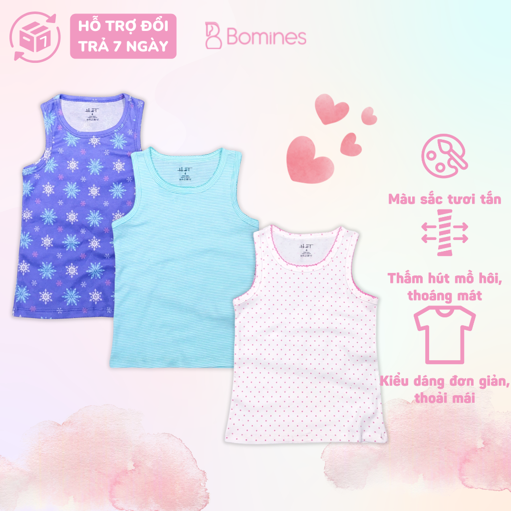 Mỗi Set gồm 3 sản phẩm áo ba lỗ bé gái cực dễ thương, họa tiết nhẹ nhàng phù hợp mặc nhà hàng ngày, đi chơi. Chất liệu vải thun xuất khẩu 100% cotton cao cấp co giãn 4 chiều.